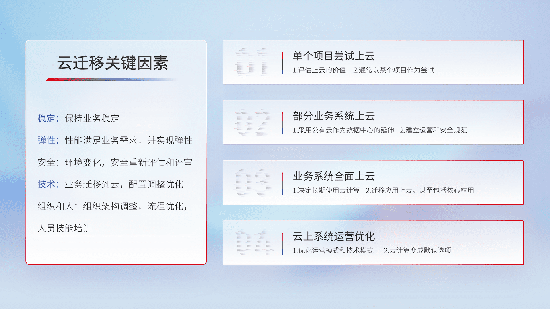 结合实际业务,,从规划设计、、、、云平台选型、、、云原生改造、、、、数据迁移、、、、集成交付,,迁移全过程为客户识别最佳上云路径,,做好风险识别管理,,,,设计网络架构、、、身份权限、、、安全审计合规、、、、操作审计、、日志审计、、监控告警策略、、、、多站点容灾设计等,,对云上基础设施进行整体规划,,,,提升IT治理水平,,,以满足弹性、、高可用、、、、高性能的需求。。