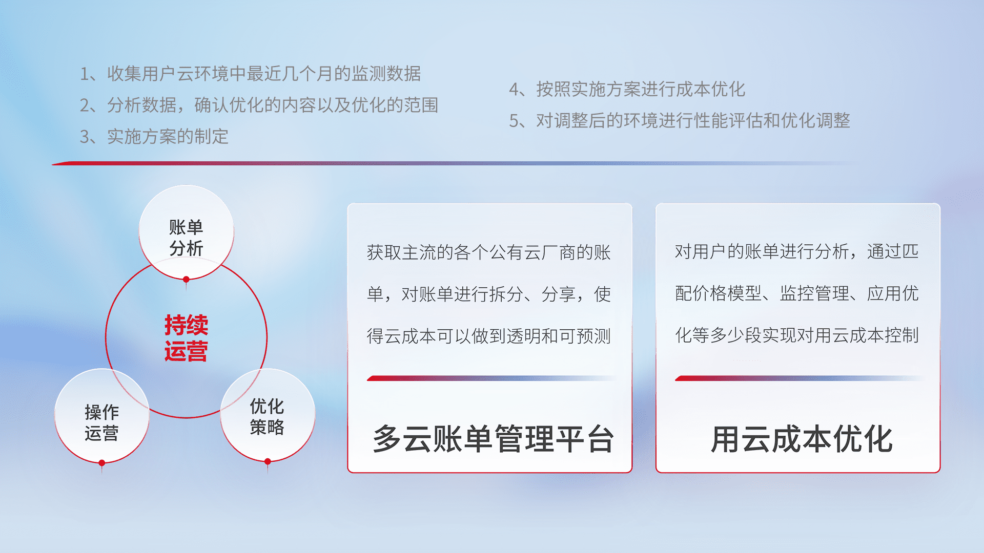 通过多云纳管,,,,以统一的资源数据模型把客户的云资源进行抽象和封装,,,进而实现对多云资源的统一操作,,,保障云资源管理的可靠性、、、稳定性与可用性。。量身定制化运维内容,,,配置、、、、开发运维、、补丁管理、、备份、、、、监控、、认证和访问管理、、审计和日常巡检等,,,,保障在用云过程中的可靠度,,,,稳定度以及高可用率。。。